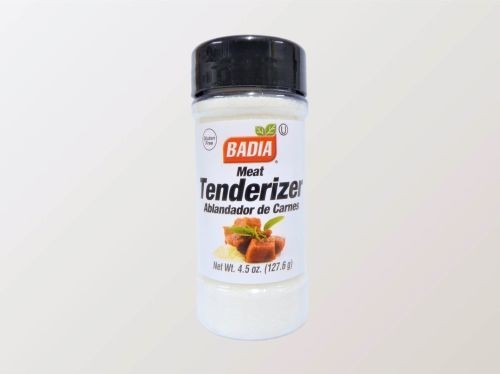 Blend that acts as a natural enzyme to tenderize raw meat without altering the flavor. Add Badia Meat Tenderizer generously and evenly to moist surfaces of meat just before cooking. Use about 1 tsp per pound of meat. Do not add salt. Pierce meat at 1/2 inch intervals and cook immediately.
